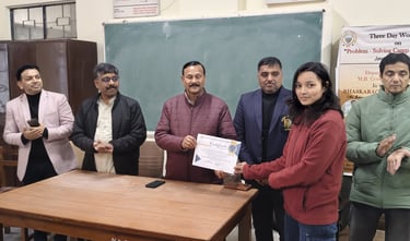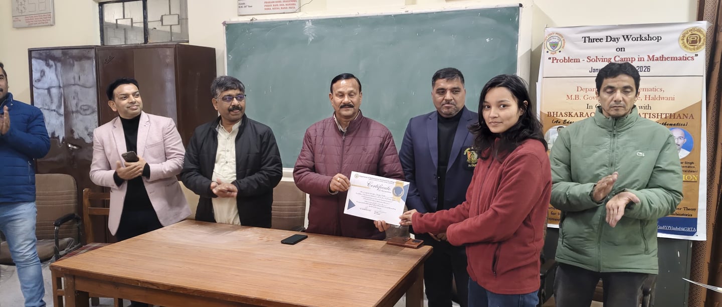 The Three-Day Mathematics Workshop focused on Problem Solving and Preparation for the Madhava Mathematics Competition was successfully conducted from January 05 to 07, 2026, at the Department of Mathematics, M.B. Government Post Graduate College. This workshop featured expert-led sessions on Complex Analysis, Calculus, Algebra, Number Theory, Differential Equations, and Matrices, equipping students with essential problem-solving techniques and strategies for succeeding in competitive examinations.