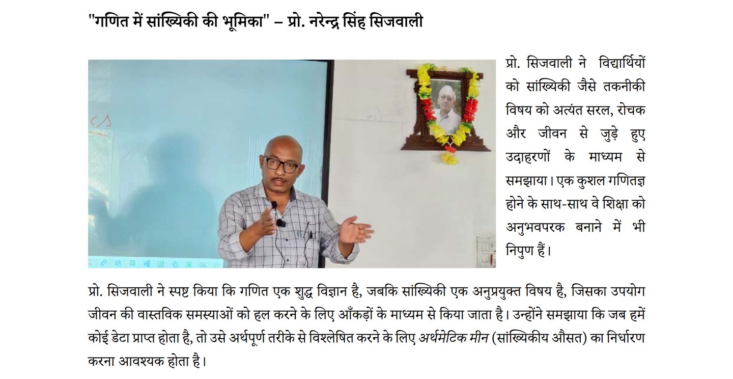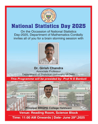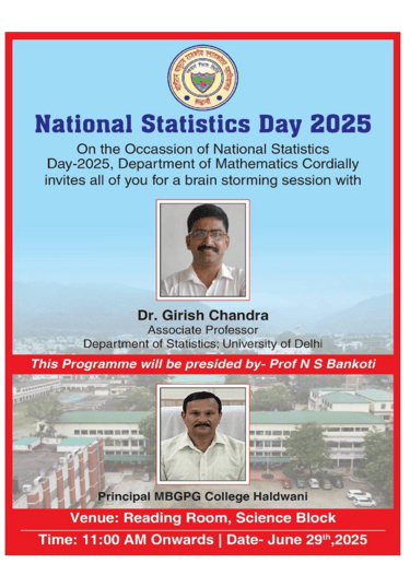 Report on National Statistics Day 2025: On the occasion of National Statistics Day, a comprehensive and meaningful seminar was organized on June 29, 2025, under the aegis of the Department of Mathematics. The aim of the workshop was to promote awareness about the importance of statistics in daily life and introduce students to its wide-ranging career opportunities and applications.