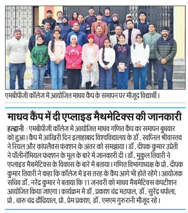 On January 5, 2026, the Department of Mathematics at M.B. Government Post Graduate College officially commenced a three-day workshop. This workshop is specifically organized to enhance the problem-solving skills of students in preparation for the Madhava Mathematics Competition.The program was inaugurated under the chairmanship of the college Principal, Dr. N.S. Bankoti. In his address, he emphasized the vital necessity of practical knowledge in mathematics beyond just theoretical study.