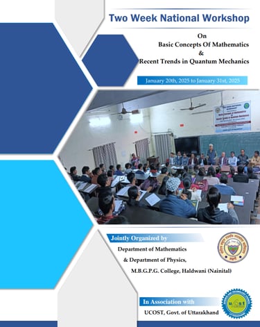 This document is a comprehensive report on a Two-Week National Workshop titled "Basic Concepts of Mathematics & Recent Trends in Quantum Mechanics," jointly organized by the Departments of Mathematics and Physics at M.B.G.P.G. College in Haldwani, Uttarakhand, from January 20th to 31st, 2025, and sponsored by UCOST. The workshop's objectives included strengthening foundational mathematical knowledge required for quantum mechanics and introducing advanced topics like quantum entanglement, computing, and field theory to foster interdisciplinary collaboration. The report outlines the detailed daily schedule of expert lectures covering diverse subjects—from group theory and topology to relativistic quantum mechanics. Furthermore, it features a collection of reflective feedback essays from participants—ranging from undergraduate and postgraduate students to faculty and research scholars—who shared how the workshop's interactive sessions and distinguished speakers significantly enhanced their understanding, critical thinking skills, and inspiration for future research.
