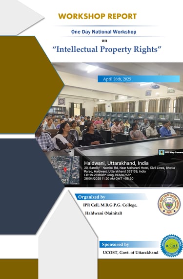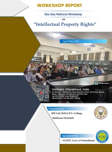 The provided document is a report on a One-Day National Workshop on "Intellectual Property Rights" held on April 26, 2025, at M.B.G.P.G. College in Haldwani, Uttarakhand. Organized by the college's IPR Cell and sponsored by the Uttarakhand State Council for Science and Technology (UCOST), the event was designed to spread awareness about fundamental IPR concepts—such as patents, copyrights, and trademarks—among students, researchers, and faculty members. The workshop featured expert lectures from dignitaries including Dr. Hitesh Chandra Pant, Dr. Bipin Chandra Joshi, and Dr. Neelima Ohri, who discussed the strategic role and relevance of IPR in protecting innovations within academia and research. To further engage the participants, the event also included an interactive quiz and successfully fostered a collective enthusiasm for integrating intellectual property knowledge into the academic ecosystem.